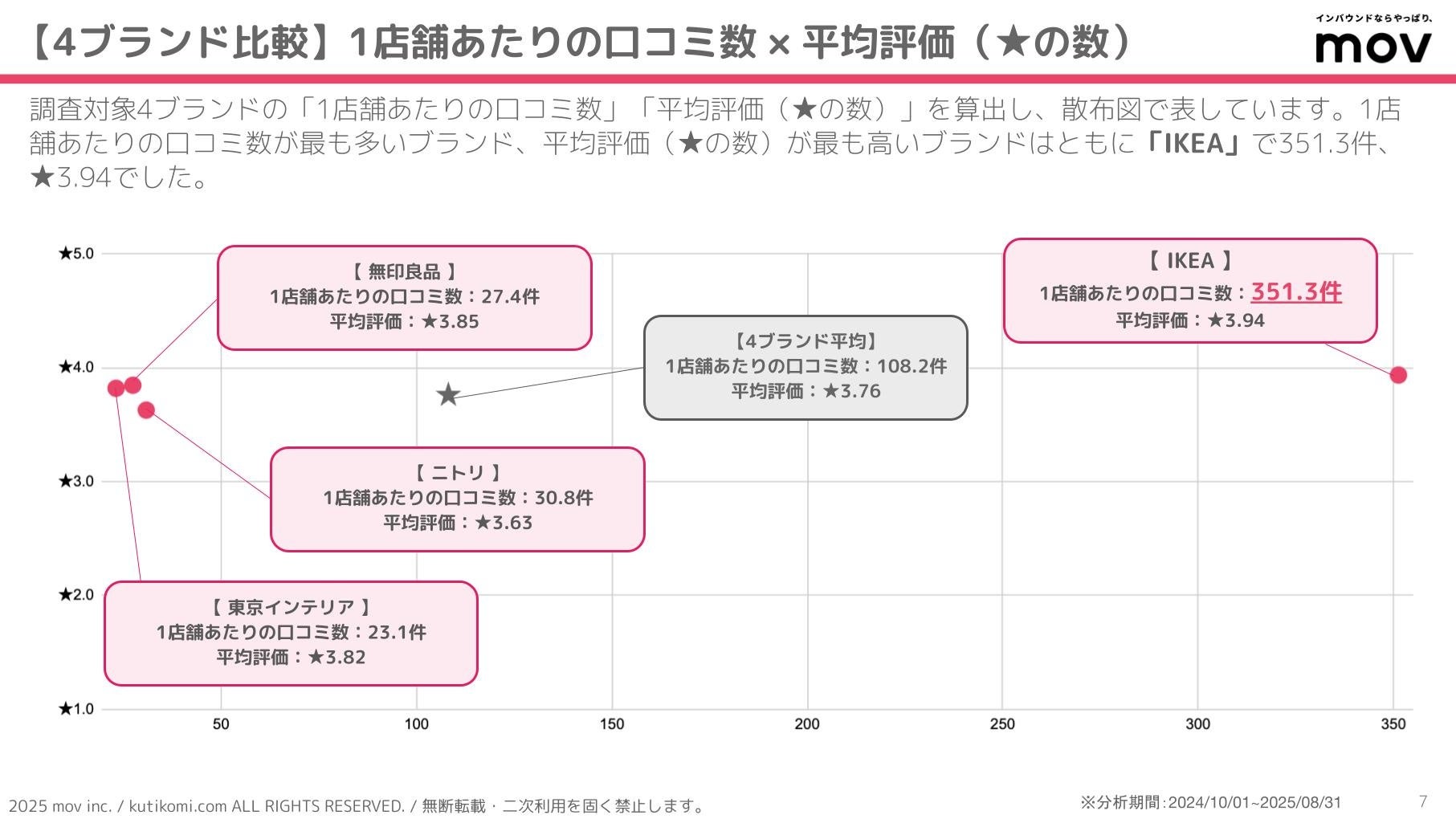 こちらの散布図では、調査対象4ブランドの「1店舗あたりの口コミ数」「平均評価(★の数)」を算出しています。1店舗あたりの口コミ数が最も多いブランド、平均評価(★の数)が最も高いブランドはともに「IKEA」で351.3件、★3.94でした。