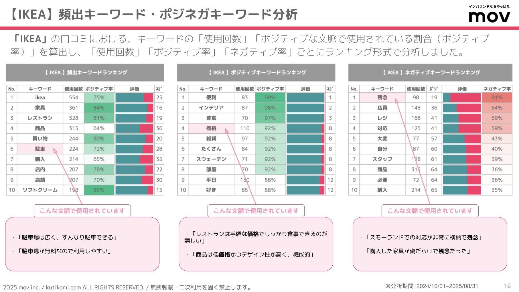 こちらの表では「IKEA」の口コミにおける、キーワードの「使用回数」「ポジティブな文脈で使用されている割合(ポジティブ率)」を算出し、「使用回数」「ポジティブ率」「ネガティブ率」ごとにランキング形式で分析しています。