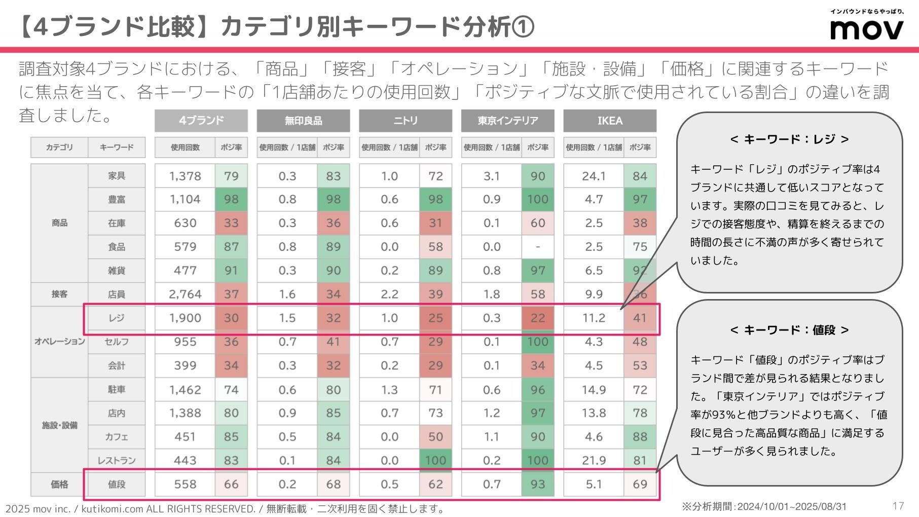 こちらの表では、調査対象4ブランドにおける「商品」「接客」「オペレーション」「施設・設備」「価格」に関連するキーワードに焦点を当て、各キーワードの「1店舗あたりの使用回数」「ポジティブな文脈で使用されている割合」の違いを調査しています。
