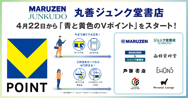 株式会社丸善ジュンク堂書店(本社:東京都中央区、代表取締役社長:中川清貴、以下「丸善ジュンク堂書店」)とCCCMKホールディングス株式会社(本社:東京都渋谷区、代表取締役社長 兼 CEO:高橋誉則、以下「CCCMKHD」)、三井住友カード株式会社(本社:東京都江東区、代表取締役社長:大西幸彦、以下:「三井住友カード」)は、2024年4月22日(月)より、丸善ジュンク堂書店が運営する店舗にて、「青と黄色のVポイント」が貯まって使えるサービスを開始いたします。
