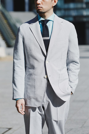 高温多湿な日本の気候に重宝するコードレーンセットアップ。淡いグレーのコードレーンは、羽織るだけで品のある着こなしを実現してくれます。さらっとした白シャツや、今回着用しているリネン100%のシャツを合わせることで涼しげな見た目と、酷暑でも快適な着心地を叶えます。また、コードレーンにはニットタイが最適。程よい光沢が、Vゾーンに上品さと洒落感を演出します。