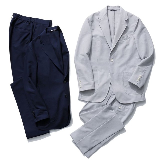 ストレッチ性を備えたコードレーンサッカー生地のセットアップ。カジュアル化するビジネスシーンに向けて作られたセットアップは、ジャケットを付属のゴムバンドでコンパクトに収納可能なラップ(包む)仕様です。また、ボトムはリラックス感のあるウエストシャーリングを採用しています。