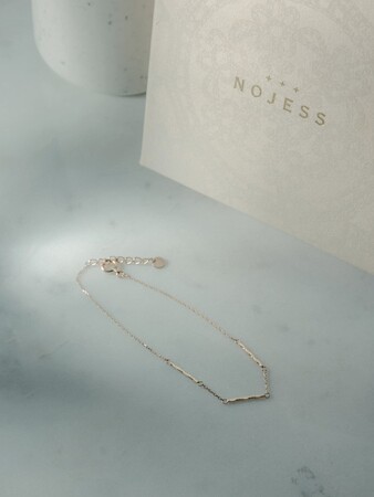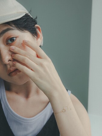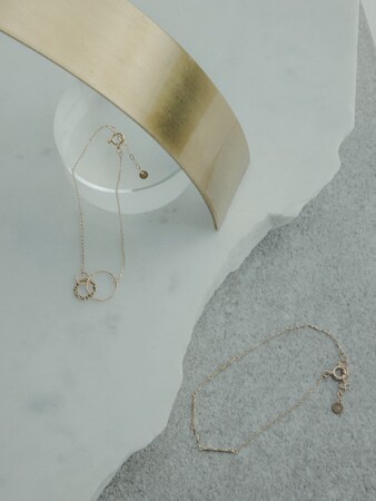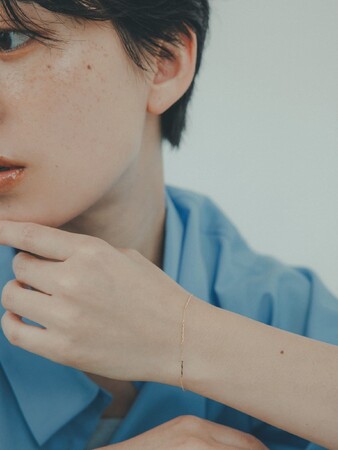 10金のシンプルなチェーンに、地金のラインパーツを配置したステーションブレスレット。凛とした表情を見せ、コーディネートを繊細に彩ります。