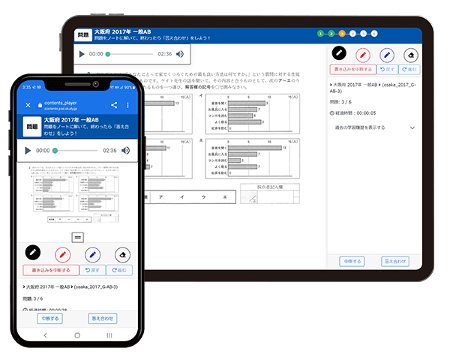 スマホ、タブレット、PCでの受講に対応。アプリのインストールは不要。学習塾でも自宅でも、生徒が自立的に練習できるICT教材として、講師の手間をかけず効率的に実施できます。