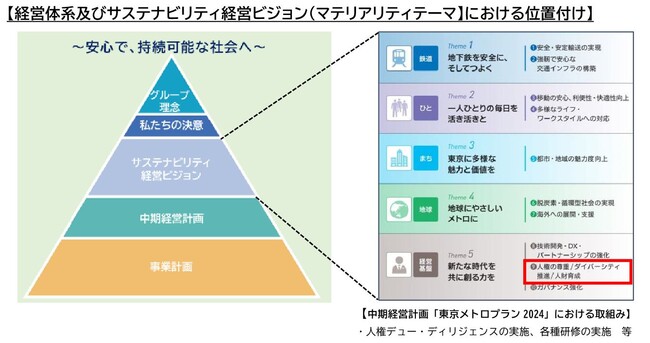 なお、サステナビリティ経営ビジョンにおいて「人権の尊重」をマテリアリティ(重要課題)として定めており、新たな中期経営計画「東京メトロプラン2024」においても関連指標をKPIとして設定し、様々な取組みを進めてまいります。