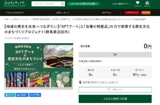 群馬県沼田市(市長:星野 稔、以下「沼田市」)、国内最大級のふるさと納税総合サイト「ふるさとチョイス」(https://www.furusato-tax.jp/ )を企画・運営する、株式会社トラストバンク(本社:東京都渋谷区、代表取締役:川村憲一、以下「トラストバンク」)とCoinBest株式会社(本社:東京都中央区、代表取締役社長:雒東生、以下「コインベスト」)は、本日5月22日トラストバンクが提供する、ふるさと納税制度を通じてクラウドファンディング型で寄付を募る仕組み「ガバメントクラウドファンディング(R)」(以下「GCF(R)」)で“「NFTアート」と「自慢の特産品」の力で実現する歴史文化のまちづくりプロジェクト”を開始します。