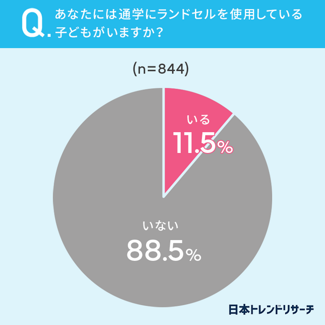 アンケート回答者のうち、11.5%が「通学にランドセルを使用している子どもがいる」と回答しました。