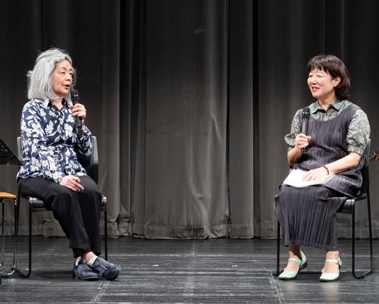 聞き手を務めた松永美穂さんはドイツ文学の翻訳家で、多和田葉子さんと長年親交のある文学者です。「日本では小説家のイメージが強いかもしれませんが、実は早い時期から戯曲も書いていらっしゃいました。今日はオペラの話なので、戯曲のことをまず伺っていこうと思います」とトークを始めました。