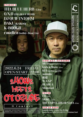 THA BLUE HERBのライヴの魅力が、O.N.Oの電子音楽科学と、DJ DYEのフロアメイクに裏付けられた、多層的なサウンドと言葉の連続によるミニマリズムから発生される途方もないサイケデリアという一面を持っているのはいうまでもない。未体験のサイエンスフィクション、意味と意味の重なりが導く言葉と音の桃源郷。THA BLUE HERBの帰還、Contactのシステムの準備が整った。さらにメインフロアには、DJ QUIETSTORM、BAKU(KAIKOO)といったトップクラスに、90年代ヒップホップ ・パーティ “CLASSICS” 主催K-BOOGIE、東京に一つのモダン・ビートミュージック・シーンを創り出したCASHYことraudicaのビートライヴなど、この夜を燃焼しようと試みる熱狂的なヘッズの欲望に十分に応えうるラインナップが固める。