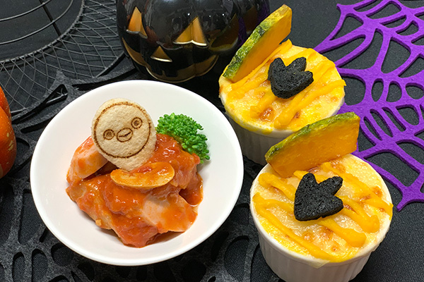 Suicaのペンギンの焼印が押されたさくさくのパンが飾り付けされ、Suicaのペンギンの好物お魚ソーセージがはいったチキンのトマト煮込みと可愛い足跡がのったかぼちゃのグラタン。