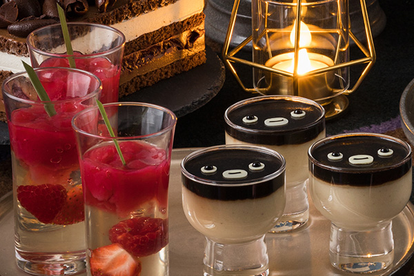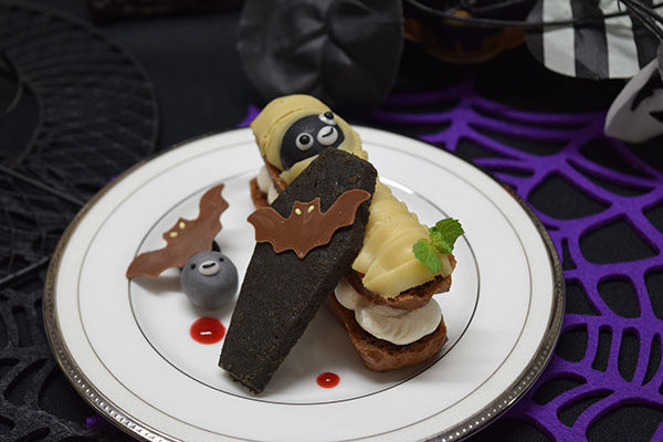 スイーツは人気のブラックベリーのタルトをはじめ、チョコレートのバスクチーズケーキ、・レーズンとアーモンドプラリネのムース、洋ナシのコンポートと赤ワインのスープ、フランボワーズのクレメダンジュ、えびすかぼちゃのモンブラン、イチジクのアリュメット、ブラッドオレンジのゼリー、クリームチーズとシャインマスカットのヴェリーヌ、キャラメルとコーヒーのヴェリーヌなど、ハロウィーン気分満載のメニューをラインナップ。