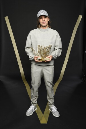 2月10日にパリで開催された、第38回「Victoires de la Musique」の授賞式に出席したオレールサン。キム・ジョーンズによる2023年フォール メンズ コレクションより、袖にギャザーが施されたバックオープニングのグレーウールとリネンのテイラードトラックスーツに同色のプリーツパンツ、「CD ダイヤモンド」のキャップと「CD ダイヤモンド」キャンバスがあしらわれたグレーの「B27」ロートップスニーカーを合わせた装いで登場しました。