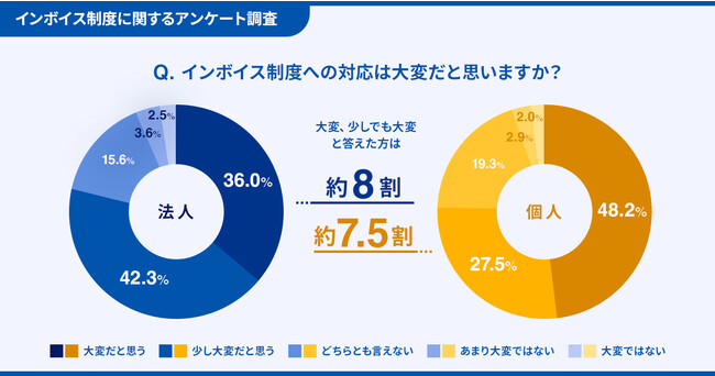 インボイス制度対応を大変だと感じている割合は法人で約8割、個人事業主で約7.5割と、共にインボイス制度対応を負担に感じているということが明らかになりました。
