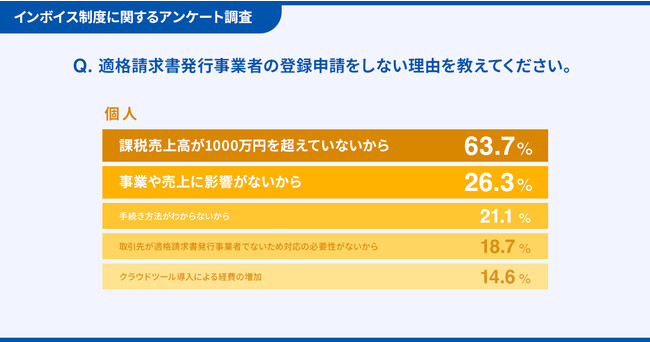 個人事業主が適格請求書発行事業者登録申請をしない理由として、最多は「課税売上高が1000万円を超えていないから」、続いて「事業や売上に影響がないから」でした。こちらの結果から、