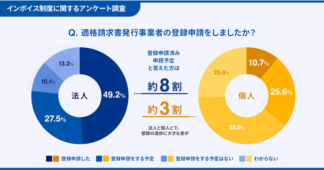 法人では「登録申請済み」あるいは「登録申請予定」の回答が合計約8割と、大部分が適格請求書発行事業者になるために申請済み、または申請する意向があることがわかりました。一方、個人事業主は約3割と、法人に比べ登録申請が少ないことがわかります。