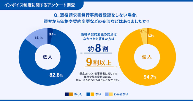 適格請求書発行事業者登録申請をする予定はないと回答した法人の約8割、個人事業主の約9割が顧客から価格や契約変更などの交渉は「ない」と回答しました。顧客側が、売り手の取引先が免税事業者か課税事業者かをまだ把握出来ていないため番号の確認にも至っておらず、したがって取引変更等も行われていないことがわかりました。