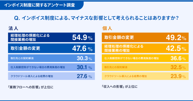 インボイス制度の対象者にとってのマイナス影響として、法人は「経理処理の煩雑化による間接業務の増加」が1位になり、個人事業主では「取引金額の変更」が1位となりました。法人では取引先数や、受領する請求書の枚数が個人事業主に比べて多くなるケースがほとんどのため、経理処理の悩みを抱えやすいことがわかります。