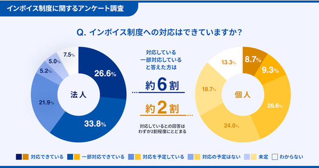 しかし、インボイス制度対応の状況については、法人は「対応出来ている」「一部対応出来ている」との回答は約6割だったのに対し、個人事業主は約2割と、対応状況には法人と個人事業主とで差が見られました。