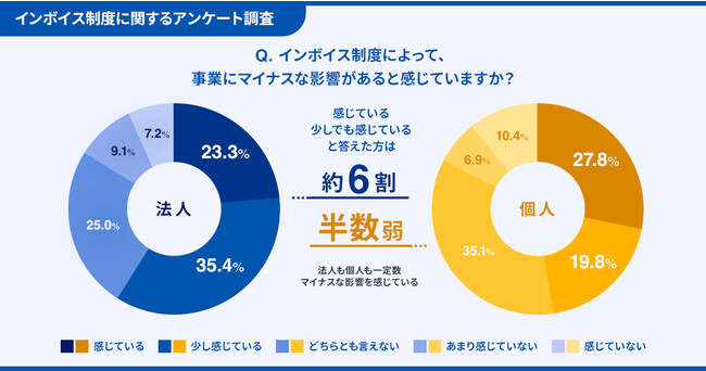 ・インボイス制度のマイナス影響を、法人・個人事業主共に約5~6割が「感じている」と回答