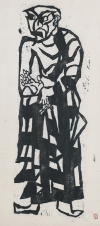 ■木の魂というものをじかに生みだす『棟方板画前期(~1944年)』民芸運動の三師、柳宗悦・河井寛次郎・濱田庄司に出会い、その思想に触れ、版画としては官展史上初の特選受賞。代表作となる「二菩薩釈迦十大弟子」などを次々と発表。版画界に限らず日本美術界に新風を吹き込む。