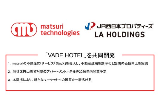 matsuri technologies株式会社(本社:東京都新宿区)はJR西日本プロパティーズ株式会社(本社:東京都港区)と株式会社ラ・アトレ(本社:東京都港区、株式会社LAホールディングスの子会社)とともに、3社で初めてアパートメントホテルの共同開発プロジェクトに取り組みます。