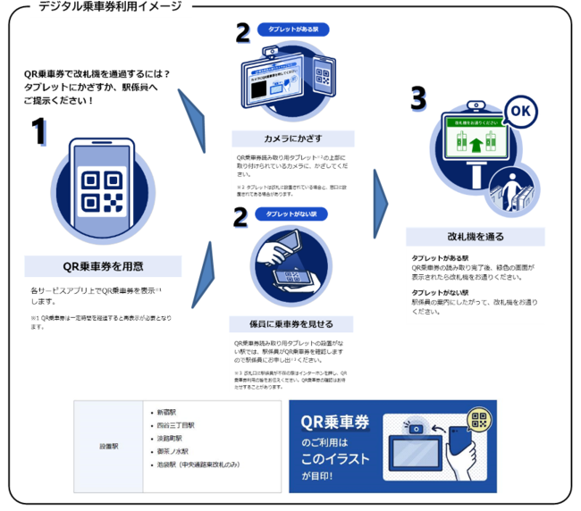 ※2:タブレットを設置していない駅においては、駅係員がデジタル1日券(QRコード)を確認の上、ご案内します。