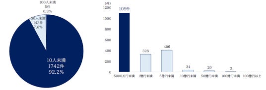 従業員数別でみると、「10人未満」が1742件で最も多く、92.2%を占めた。「10人以上50人未満」が143件、「50人以上100人未満」が5件で続いた。『100人以上』は2年連続で発生せず、小規模事業者が大半を占めた。