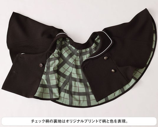 チェック柄の裏地がチラッと覗くケープなど、隅々まで可愛らしさたっぷりの一着。