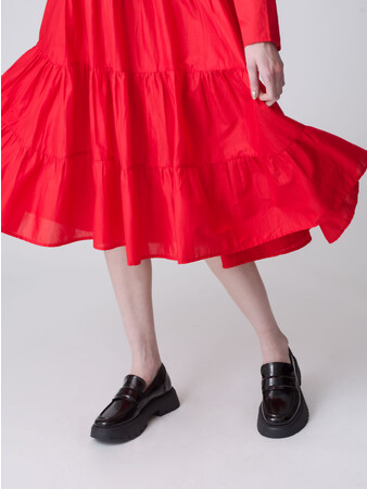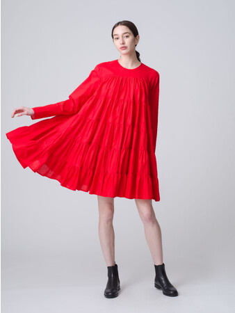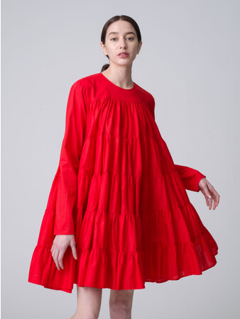 Merletteのファーストコレクションで発表されて以来、世界中で愛されているベストセラーアイテム。すっきりとしたヨークからボリュームたっぷりのティアードが裾まで広がるデザインで、身体が美しく見える丈感やバランスが人気です。マニッシュなシューズを合わせて一枚で着るのはもちろん、デニムと合わせてチュニックとしても着方のアレンジが可能です。