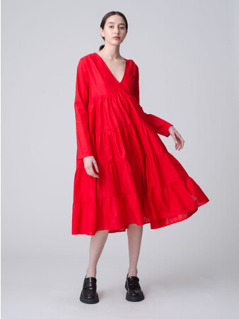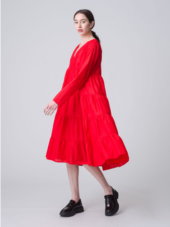 ふんわりと優しく身体を包み込むロングタイプのティアードドレスです。深めに開いた V ネックが鎖骨や顔周りをすっきりと美しく仕上げてくれます。リラックス感漂うデザインはリゾートなどの旅先でも大活躍。冬はインナーにタートルネックを合わせたスタイルがおすすめです。夏はサンダル、冬はロングブーツなど足元を変えるだけで一年中楽しめます。