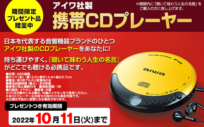 株式会社ユーキャン(東京都新宿区 代表取締役社長:品川 泰一)は、CD全集『聞いて味わう人生の名言』の販売を開始しました。発売を記念しまして、10/11(火)まで期間限定プレゼント「携帯CDプレーヤー」を贈呈いたします。