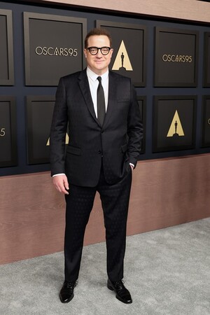 俳優のブレンダン・フレイザーは、キム・ジョーンズによるメンズコレクションより、「CD ダイヤモンド」ジャガード モチーフがあしらわれたブラックスーツにホワイトコットンシャツ、ブラックレザーのダービーシューズを合わせた装いで登場。