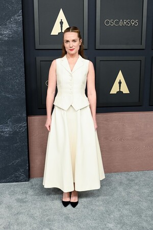 女優のケリー・コンドンは、マリア・グラツィア・キウリによるディオールのオートクチュール コレクションより、ウエストコートにアイボリーのドライウールのプリーツスカート「ミス ディオール」を纏い登場。