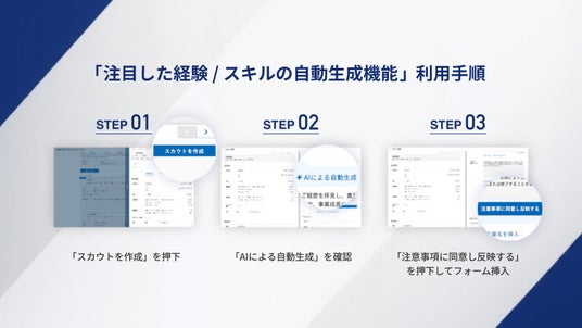 新機能は、ヘッドハンターが対象となる転職希望者(以下、対象者)のスカウトを決めた要素のうち、職務経歴書情報の「注目した経験/スキル」に関する項目について、ヘッドハンターが対象者に伝えたい文章案を大規模言語モデル(LLM)が自動生成し、ヘッドハンターに提示するものです。これにより、対象者に対してスカウト理由を具体的に示すことができるようになります。
