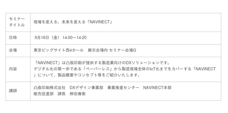 凸版印刷ブースでは、「工程管理」や「在庫管理」など4つのアプリケーションをテレワーク先からでも操作可能な「NAVINECT(R)クラウド」と、装置から自動取得した製造情報を高速処理し、生産性の向上に寄与する「NAVINECT(R)エッジ」の代表的なアプリケーションについてデモを実演します。