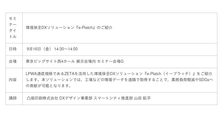 また、出展社によるプレゼンテーションとして、場内のセミナー会場にて、「現場を変える、未来を変える『NAVINECT』」、「環境保全DXソリューション『e-Platch』のご紹介」というタイトルで、それぞれ凸版印刷の社員によるセミナーを行います。