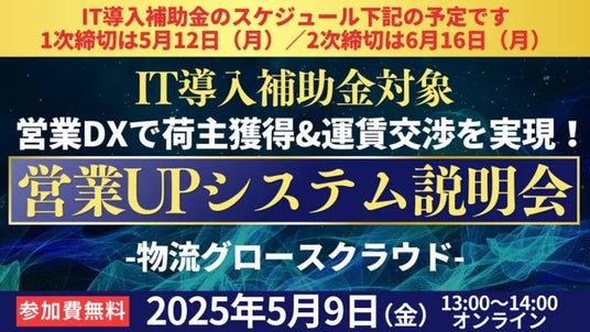 日本最大級の物流コンサルティングファーム 船井総研ロジ株式会社(本社:東京都中央区、代表:橋本直行、以下「船井総研ロジ」)は、2025年5月9日(金)13:00~14:00、 運送会社・物流会社の経営者を対象にした「【IT導入補助金対象】運賃交渉の成功率を上げる営業DXツール説明会」をオンラインで開催いたします。