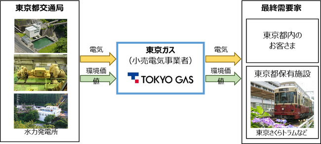 購入した電気は、東京都が保有する東京さくらトラム(都電荒川線)や都営バス全営業所へ供給するとともに、約1億kWh/年の電気を東京都内のお客さま向けに供給し、都内における再生可能エネルギーの普及拡大に貢献します。なお、本水力発電所由来の電気供給によって、東京さくらトラム全線の運行に必要な電力が、初めて再生可能エネルギー100%となります。