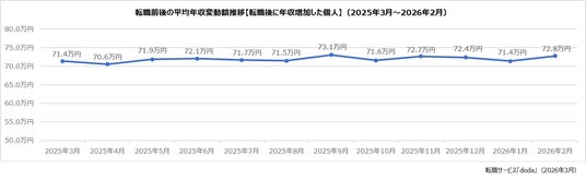 転職前後の平均年収変動額【転職後に年収増加した個人】:+72.8万円(前月差:+1.4万円)