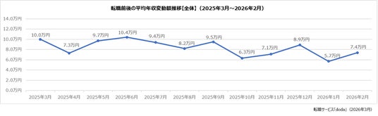 パーソルキャリア株式会社が運営する転職サービス「doda(デューダ)」(編集長:桜井 貴史)は、dodaエージェントサービスを利用して2026年2月に転職決定した個人の、転職前後の平均年収変動額と年収変動割合を発表いたします。