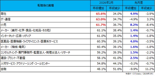 転職後に年収増加した個人が多かった業種は、「商社」(65.6%)、次いで「IT・通信」(63.0%)、そして「小売」(61.7%)が続きました。