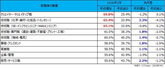 転職後に年収増加した個人が多かった職種は、「クリエイター・クリエイティブ職」(69.8%)、次いで「技術職(化学・素材・化粧品・トイレタリー)」(65.4%)、そして「技術職(SE・インフラエンジニア・Webエンジニア)」(65.1%)が続きました。