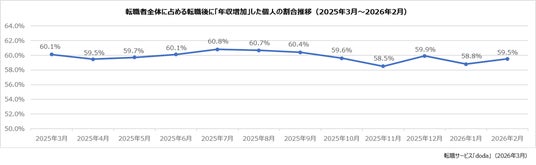 転職後に「年収増加」した個人の割合は、59.5 %(前月差:+0.7ポイント)でした。