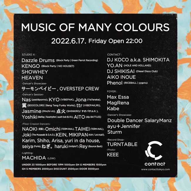 Dazzle Drumsが主催する、ハウス・ミュージックを軸にDJとダンサーがそれぞれの個性を表現し合うパーティ、Music Of Many Colours。2017年からコロナ禍においても立ち止まることなく開催を続けてきたが、第16回目のこの日がContactでの最後の開催となる。