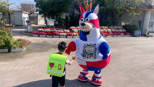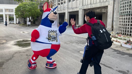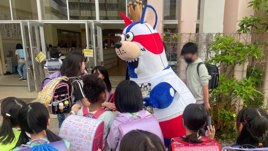 「おおきなわ」の活動の一環として実施している「ゴーディーによる朝のあいさつ運動」において、4月はホームタウン沖縄市と那覇市の小中学校を訪問し、あいさつ運動に参加いたしました。各学校の皆さま、ご協力いただき誠にありがとうございました。