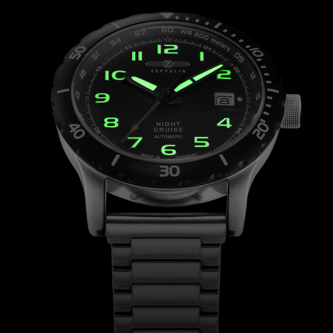 夜光塗料に覆われた針とインデックスが夜にはミステリアスに輝き、1900年代初頭に空から眺めた「エレガントで魅力的な夜景」を連想させます。