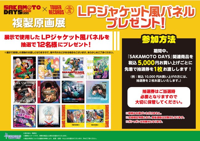 「『SAKAMOTO DAYS』×TOWER RECORDS 複製原画展」にて、対象商品を税込5,000円お買い上げごとに、先着で「『SAKAMOTO DAYS』×TOWER RECORDS 複製原画展」で展示されていた「LPジャケット風パネル」(全12種)が当たる抽選番号券を1枚プレゼント!