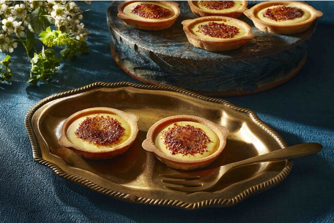 マダガスカル産バニラとラムの香りで芳醇なカスタード風味に仕立てた、とろっと柔らかなクリーム。さくっと焼いたココットタルトに流し込み、直火でパリッと香ばしくブリュレしました。ほろ苦いカラメルソースがアクセントです。
