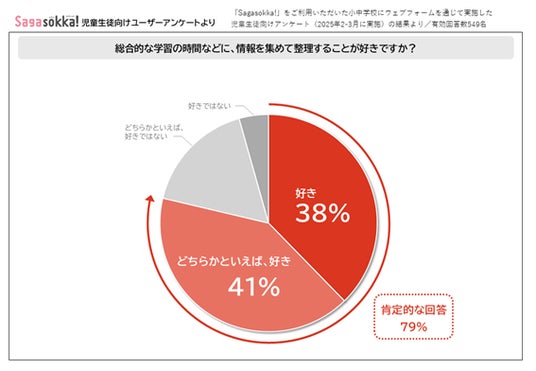 「総合的な学習の時間などに、情報を集めて整理することが好きですか?」という質問をしたところ、「好き」「どちらかといえば、好き」と肯定的な回答は79%となりました。「Sagasokka!」を使う児童生徒が、調べ学習における情報収集・整理の活動に意欲をもっていることがわかります。