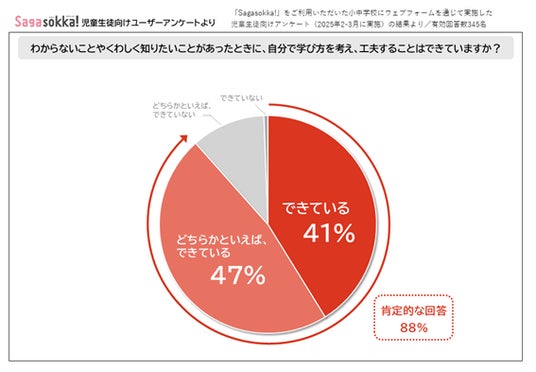 「Sagasokka!」を利用する児童生徒にユーザーアンケートを実施したところ、「わからないことやくわしく知りたいことがあったときに、自分で学び方を考え、工夫することはできていますか?」という質問について、88%が「できている」「どちらかといえば、できている」と肯定的な回答をする結果が得られました。この結果から、当サービスを利用する児童生徒において、調べ学習などの課題解決に対し自ら考え工夫に取り組んでいる、前向きな姿勢がうかがえます。